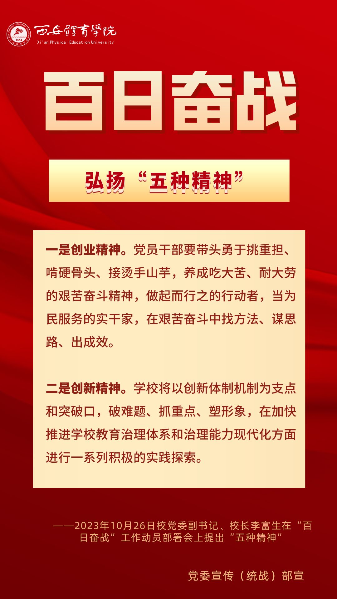 为持续掀起“百日奋战”的热潮,保持学校各项事业高质量发展的战略定力,动员全校师生员工为学校改革发展勠力同心、接续奋斗,本公众号将以专栏形式推出“百个要点”的“百张海报”,将“百日奋战”相关会议的主要会议精神和重点内容进行摘录报道,以供师生员工学习交流。