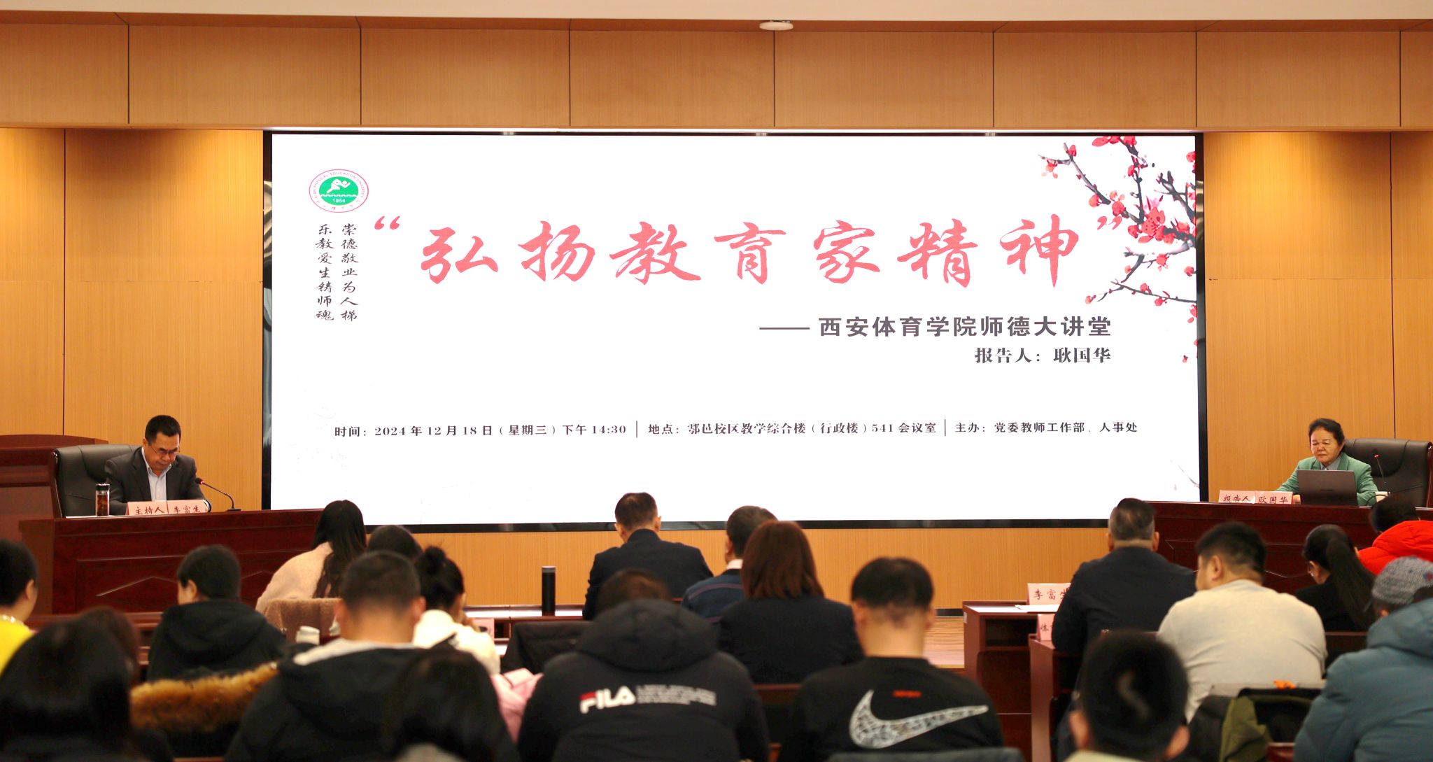 本网讯    12月18日下午,我校在鄠邑校区综合楼报告厅举行建校70周年系列活动暨“弘扬教育家精神”师德大讲堂第六场报告会。邀请西北大学二级教授、全国教学名师耿国华作《关于高校教师使命担当的体会实践》专题报告,报告会由李富生校长主持,相关部门负责人及教师代表百余人到场聆听报告。