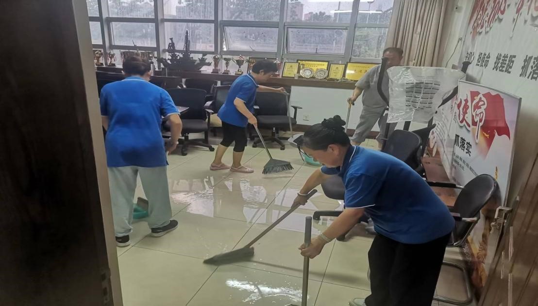 暴雨发生以来,后勤管理处(集团)班子成员以身作则靠前指挥,物业、水电、维修等部门全体工作人员始终坚守在一线,对全校进行全方位防守、全天候巡查,反应敏锐,处突抢险有力,及时发现和处置各类安全隐患,做到了险情早发现、早处置、早化解。以场馆运营中心及物业公司为依托,其他各中心协同开展安全风险点巡查,发现问题及时报告、及时安排处置;以修缮中心及物业服务公司为依托,其他各中心协调配合,通过调集抢险处置人手,利用所备各种防汛物资、工具科学开展防汛抢险的工作。暴雨过后,教学保障中心物业人员迅速行动起来对田径场、全校各处刮断的树枝、餐厅四楼屋顶的淤泥、场馆内残留的积水污渍进行了清理。